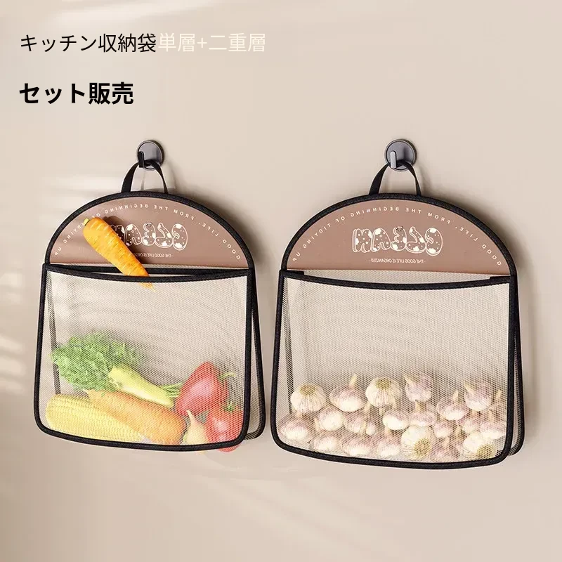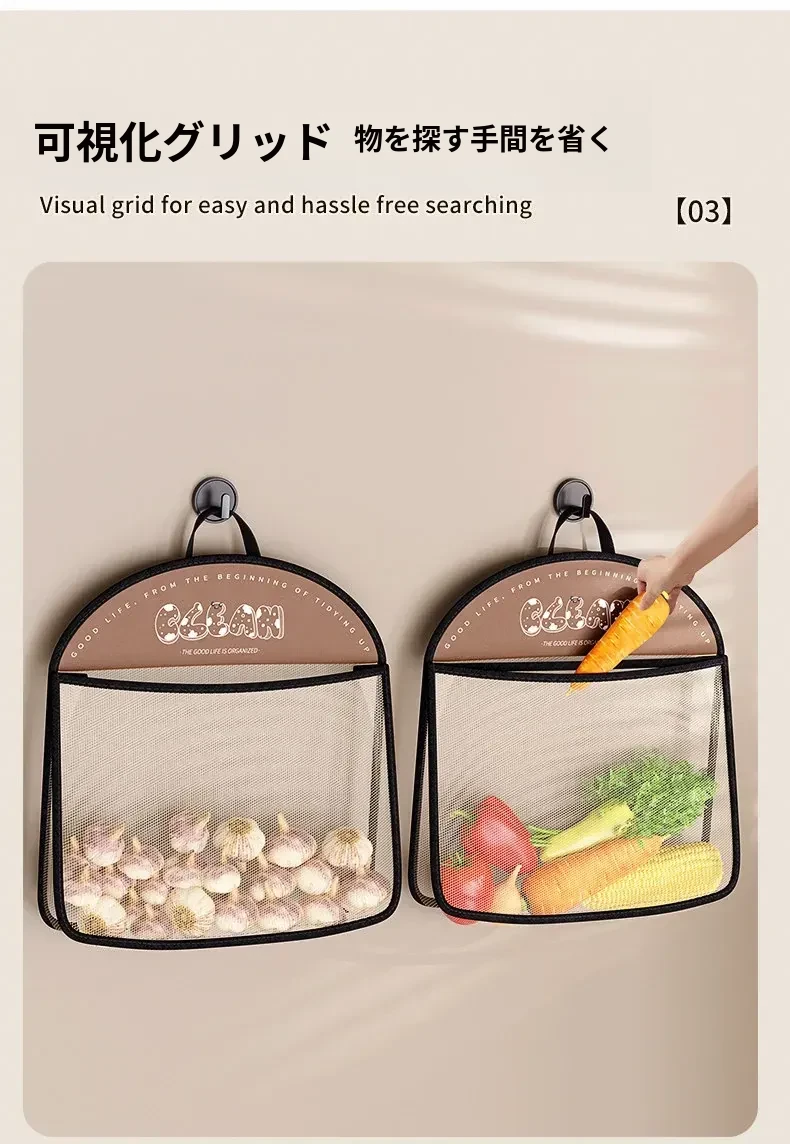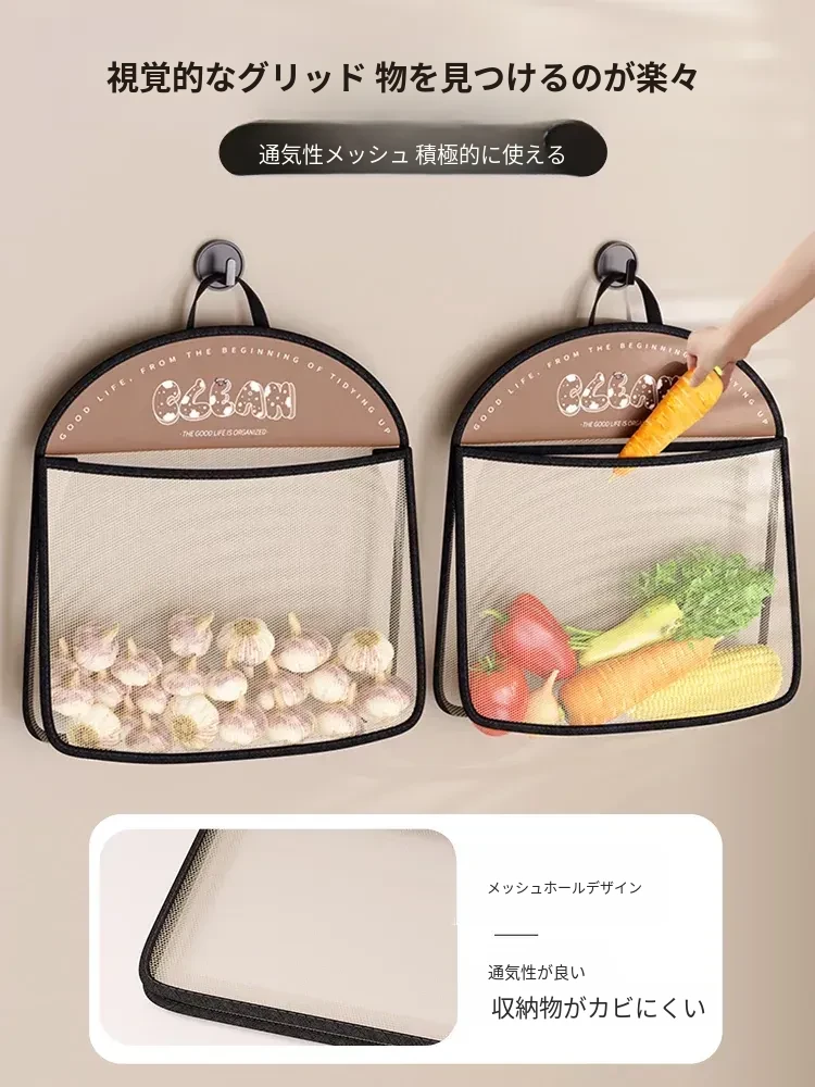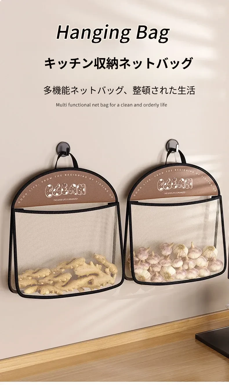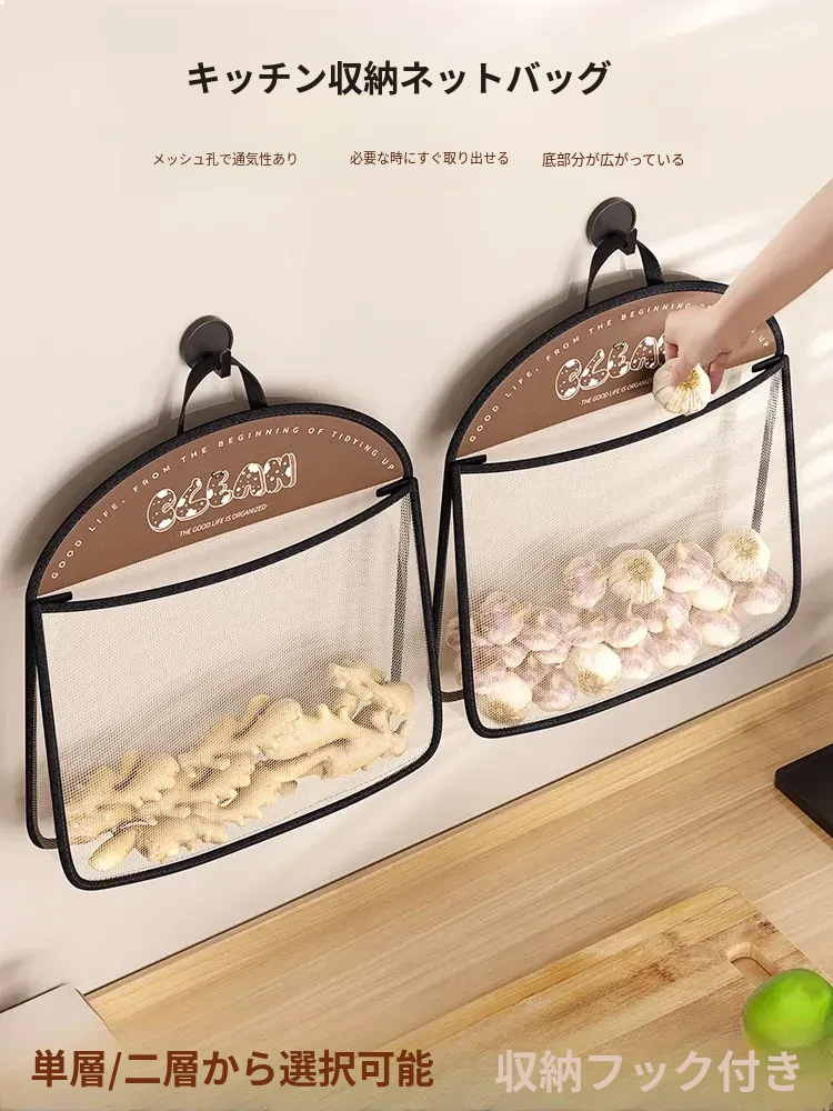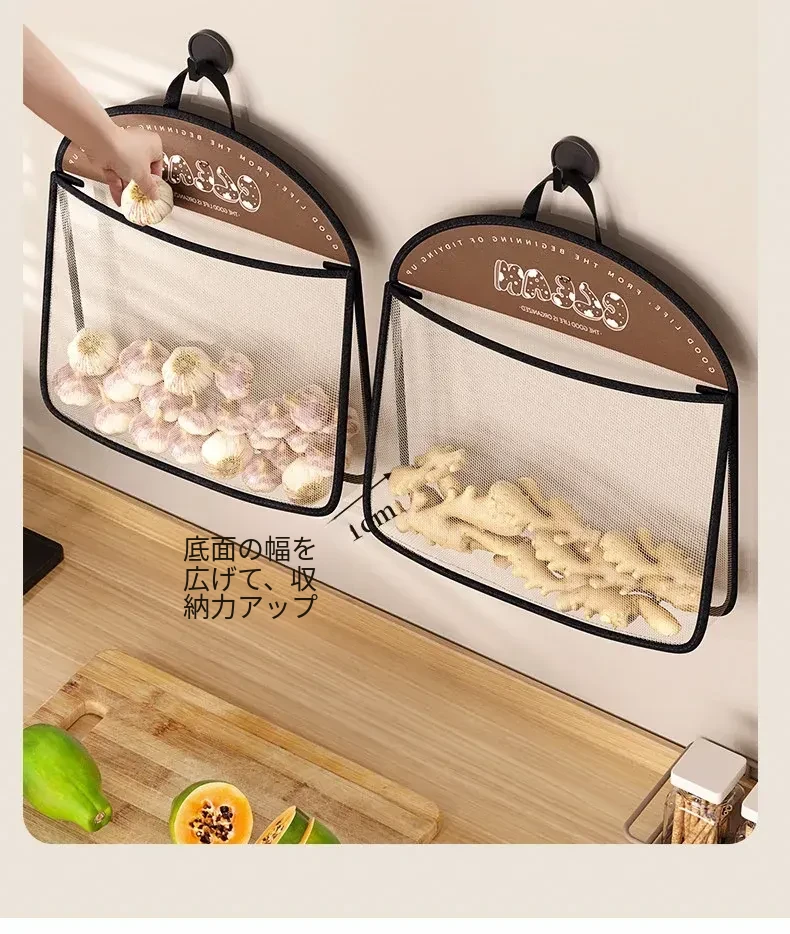生姜とにんにくの収納マジック!多機能キッチン用野菜吊り袋 - 大蒜と生姜をスッキリ収納!プラスチック製ネットバッグで、スペースを有効活用。おしゃれで便利な収納アイテムで、料理がもっと楽しくなる!