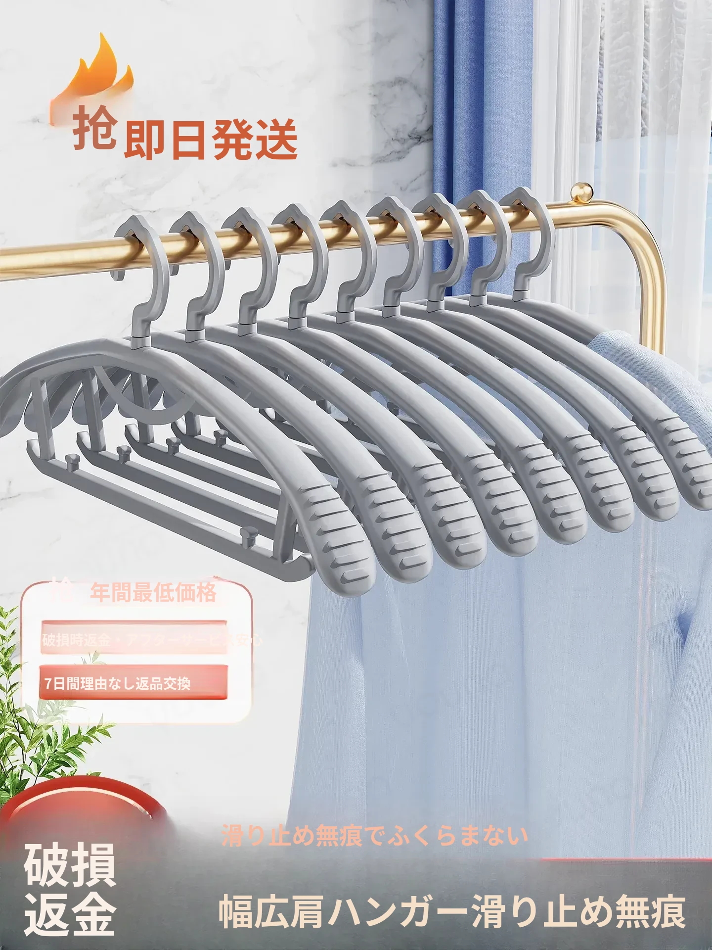 無痕・防滑・強化タイプの衣類ハンガー!学生寮に最適な大容量・太型設計で、肩の形を守りながら衣服をしっかり支えます。あなたの大切な衣類を優しく守る、家庭用ハンガーの決定版!